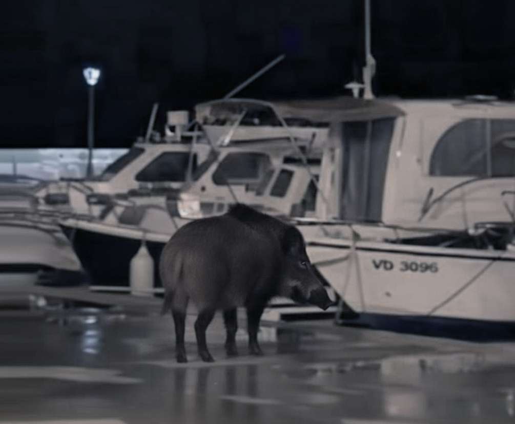Vodice: Wildschwein läuft seelenruhig der Hafenpromenade entlang